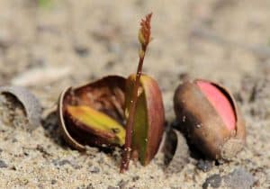 Ces glands qui germent au pied d’un chêne survivront rarement : la sécheresse aura vite raison d’eux.