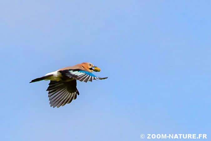 En vol, un geai serre un gland dans son bec. Photo J. Lombardie. Leur efficacité laisse pantois : sur une saison, un individu peut manipuler entre 2200 et 5700 glands ! Cette collecte entraîne les geais jusqu’à la fin octobre, lorsque les derniers glands disparaissent des arbres. Toutes les espèces de chênes sont concernées, du bocage à la forêt méditerranéenne. En Espagne, une forêt mêlant chênes verts et pins voit défiler, selon une étude (3), près de 13 geais par heure, tous affairés à emporter les glands d’un même arbre.