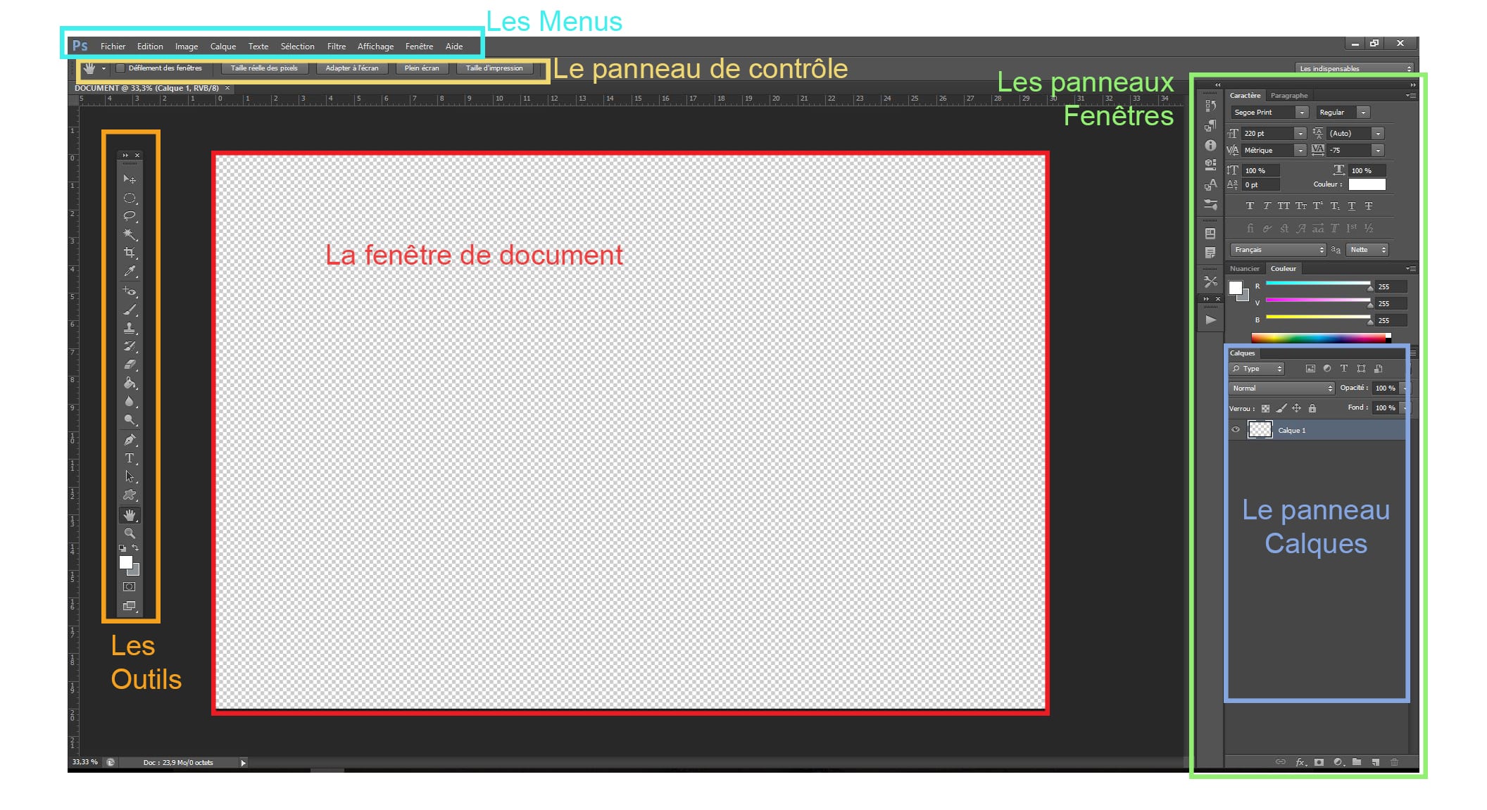 - Menus : en haut, toutes les actions principales sont regroupées : fichier, édition, image, calque, sélection, filtre, affichage, fenêtre, aide.