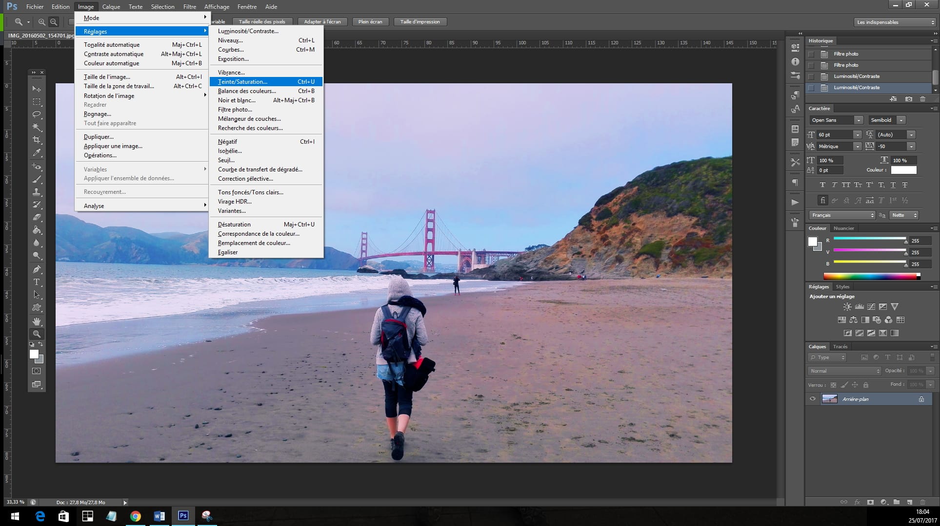- 3, Développer la photo, c’est-à-dire effectuer les réglages de base : allez dans Image > Réglages. Par exemple, augmentez la luminosité, jouez sur les contrastes, ajustez la saturation et les tons chauds pour donner plus de vie à l’image.