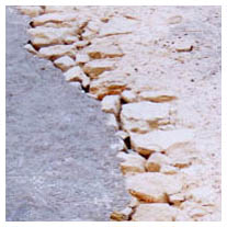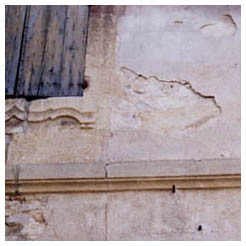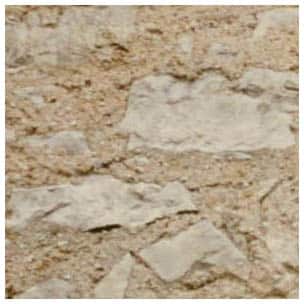 - Un éclat de plâtre laisse apparaître des grains de sable inégaux.