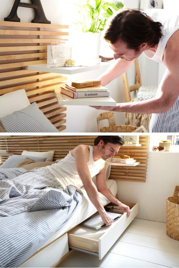 IKEA frappe fort avec une tête de lit à lattes. Quelques tablettes bien placées et vous voilà avec plusieurs espaces type tables de nuit.