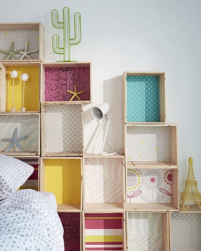 Disposez les caisses selon l’espace, fixez-les ensemble, placez-les à la tête du lit, et le tour est joué.